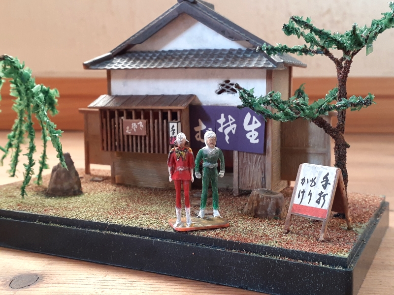 夢のコラボ、河合商会風物詩シリーズから”そば屋”とバンダイガンダムシリーズ”げるぐぐ”、堂々の1/60スケールで奇跡の出会い。早速ドラマ仕立てで紹介しましょう。
