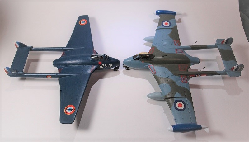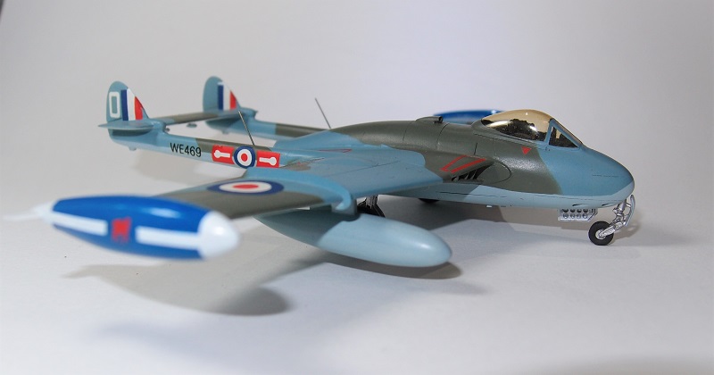 この初期のジェット戦闘機の試作機は1949年初飛行だったそうです。同じ双ブームのバンパイアの後継です。デハビランドの機体は個性的で模型映えするので大好きです。