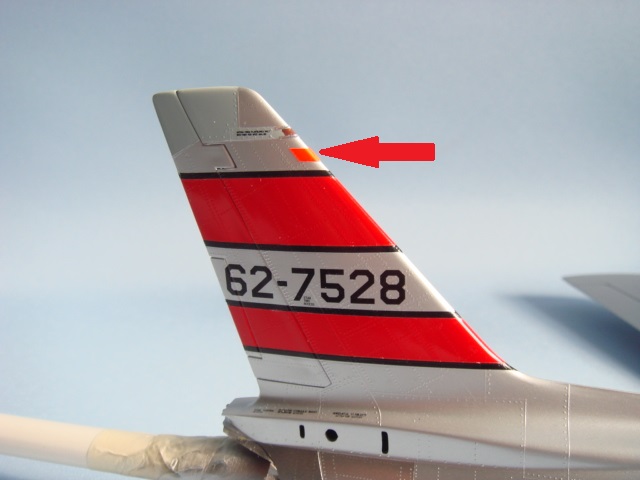 垂直尾翼前縁には蛍光レッドのシールがあり