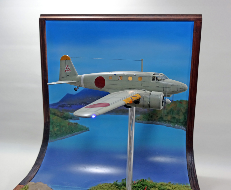 機体については当然飛行姿勢とし、双発プロペラをマイクロモーターで電動化、前照灯・翼端灯・キャビン灯をLEDで電飾しました。
