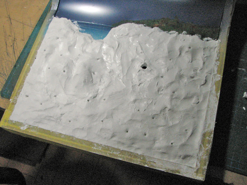 展示台そのものは木とプラ板で自作し、十和田湖の景色をラッカー塗料のエアブラシと筆塗り(点描)で描きました。