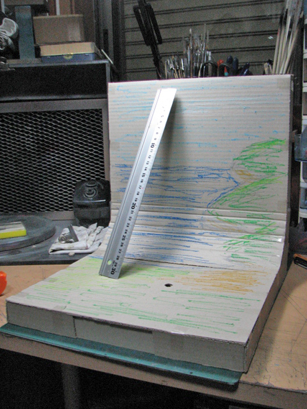 展示台はまずラフな完成イメージ絵を描いた上で、段ボールを使って実物大のモックアップを作って、イメージ通りの物ができるように確認し、寸法も決めました。