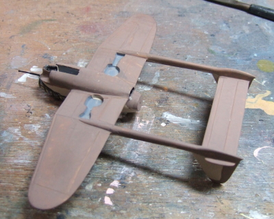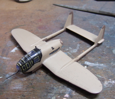 (写真7) 機首というかコクピットというかエンジンナセルというかそんな感じの箇所を貼り合せたらあとはぐんぐん進むぜデ.シェルデ。主翼とビームと尾翼関係くっつけたら下面色塗りまくって一段落。