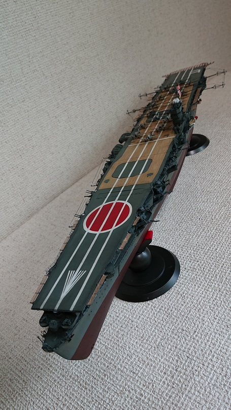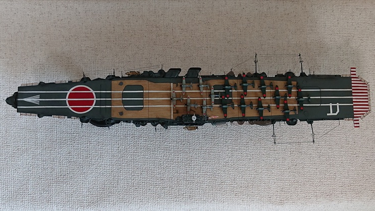 ミッドウェー海戦時で製作しました。飛龍を飛び立った最後の攻撃隊(友永雷撃隊)の再現が目的です。飛行甲板のマーキングは全て塗装。艦橋トップの高射装置は白にしました。