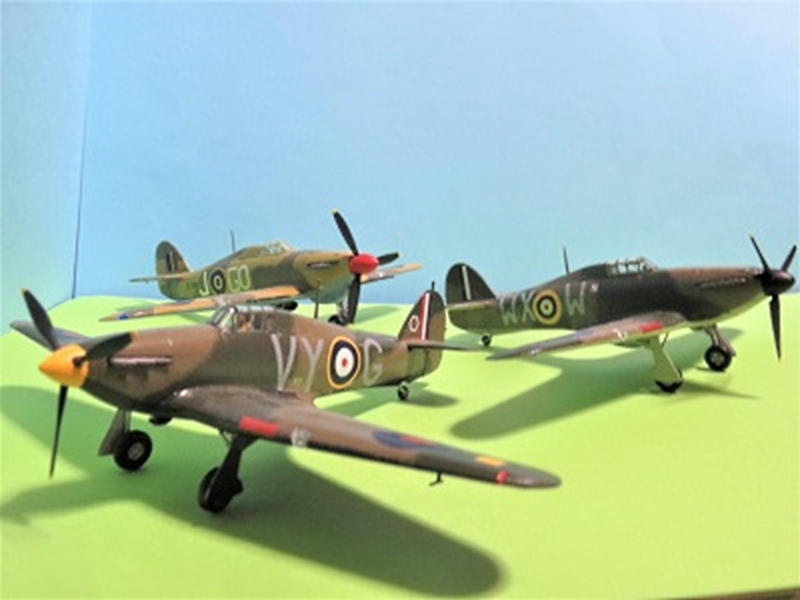 特集に合わせて4機のハリケーンを工作しましたが、完成したのは写真の3機です。右からエアフィックスのMk.Ⅰ(羽布張り)、ハセガワのMk.ⅡC、Mk.Ⅰ後期型 で、未完成はドイツレベルのMk.ⅡCです。