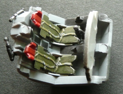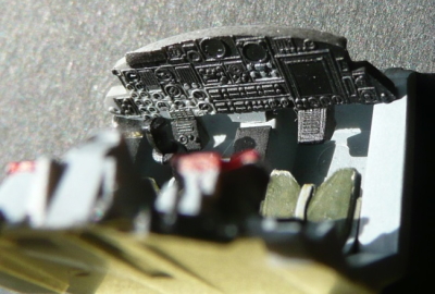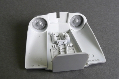 まずコクピットの組み立てですが、キットはバスタブコクピットと主計器盤、パイロット席のスティックと2個のシートの5部品で構成されています。主計器盤には計器がモールドされており、シートにはシートベルトもモールドされているので塗装して組み込めば、コクピットは完成です。(写真2)がシートを収めたコクピットで、(写真3)が主計器盤です。