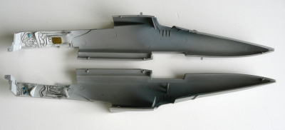 次にコクピットを組み込む前胴部を組み立てます。前胴部の左右パーツの裏側にはコクピットの側壁や主脚収納部壁面の配管類などがモールドされていますので、しっかり塗装しておきます。(写真4)が塗装した前胴部左右パーツです。写真では表が見えませんが、左右パーツにモールドされているインテイクダクト部分も主脚収納部と同様、インシグニアホワイトに塗っておきます。
