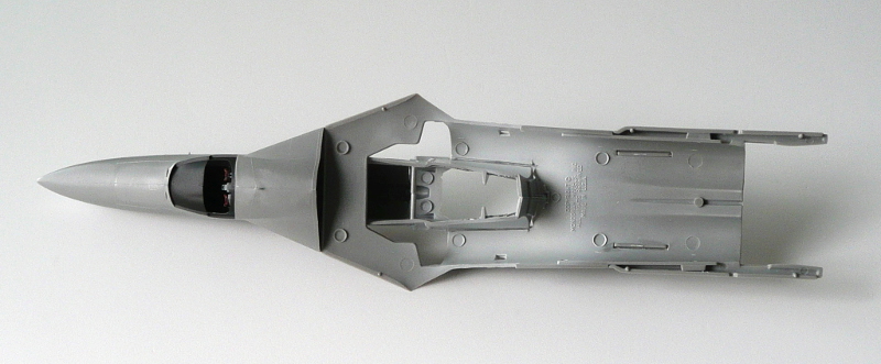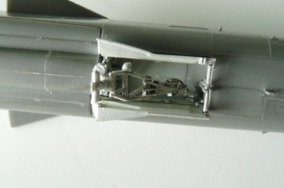 ではキットを見ていきます。実機が大型の戦闘機ですので1/72スケールでも大きいという印象です。(写真1)が全体のパーツです。動翼も固定ですので大きさ程にパーツは多くありません。クリアパーツはキャノピーが1つというシンプルさです。長い胴体は前後で2分割されています。複雑な部品も一体成型されており、また脚収納庫内にも配管のモールド等が施されているところなどは流石です。しかし前脚と前脚収納庫扉、そして主翼など、先に組み込まなければならないパーツもあり、塗装作業を考えながらインストにもよく目を通して作業にかかりました。以下、各部の工作過程のポイントについて紹介していきます。