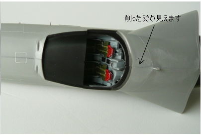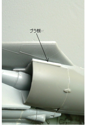 次にエアー・インテイクを取り付けます。胴体側に取り付けるとスプリッターベーンのところに隙間ができてしまいました。そのため(写真10)のようにプラ板を差し込み接着し、固着した後整形しました。写真は整形前の状態です。