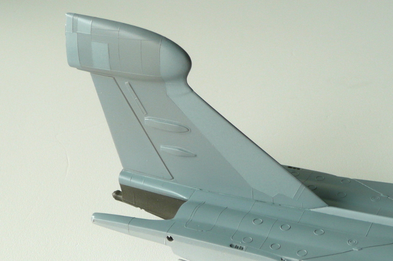 次に垂直尾翼内に収まっているECCMの受信アンテナ群のレドーム部分を機首レドームと同じミディアムグレイで塗りました。(写真15)