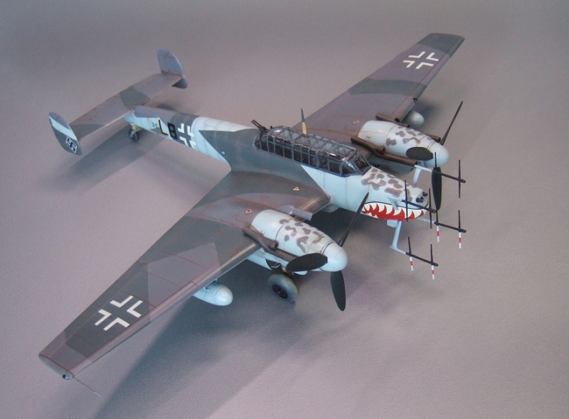 ドイツの夜戦といえば全面ライトブルーのちょー地味な機体塗装というイメージですがコイツはちょびっと派手なシャークマウス仕様。Bf110の戦隊で1940年ごろの第76駆逐航空旅団の所属機は緑の迷彩に同じシャークマウスを描いているカラー写真がありますが、もしかすると同じ流れから来ている機体かもしれないです。シャークマウスというとアメリカを思い浮かべますが実際はアメ公の方が独逸のコレを真似たらしいです。コチラが本家本元ちゅう訳ですね。
