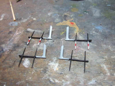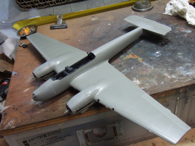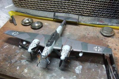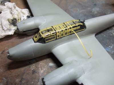 (写真11) 今回最大のヤマ場、レーダーアンテナの装着であります。支柱にピンバイスで穴開けて真ちゅう線を押し込む。後は機首にも穴開けてネジ込むだけ。でも四本分の角度決めがめちゃ面倒クサイ。勘弁してくれって感じです。