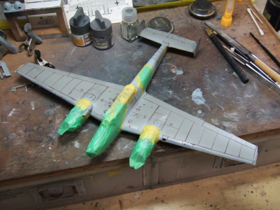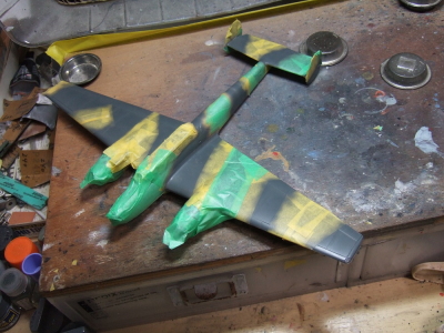 (写真9)グレーバイオレットを吹いた後にまたマスキングしてグレーグリーンをぷーと吹く。ああもう今回はマスキング大会じゃのう。