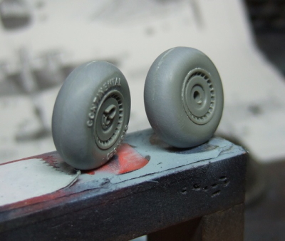 (写真10) タイヤにはびっくりするくらいに克明なロゴが刻印され、Bf110の脚特有の逆ハの字に傾斜した自重変形仕様となっております。この濃い表現力が「流石モノグラム」。わたしとしては「きゃーステキ」と喜ぶ所なんですけれどコレがヤダとかいうお方もいらっしゃって、世の中はやはり広いもんだとしみじみ思う次第。