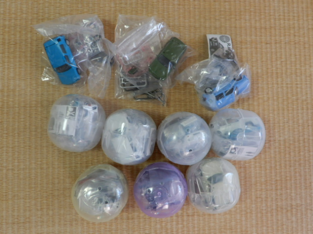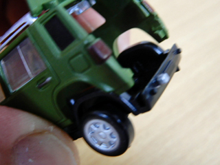 ダブりが4個出ましたが,早まってガチャガチャの近くにいたお子さんにあげたり,帰りに中古屋によって売ったりしてはいけません。(←断言!)成形不良や組み立て中の部品の破損に備えるためです。今回,ウィンドウの成形不良が1件,スペアタイヤのステーの組み立て中の破損(←すごく細くて脆いのに組み付けがきつい)が3件,ホイールの塗装忘れが1件ありました。塗装も荒く,クローズアップに耐えられないものが数個ありました。ということで,手に入った10個は,最大限に活きることになりました。