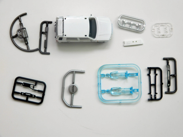 塗装済みのほとんど完成している車体に,ヘッドライトやルーフレールなどの部品を取りつける構成になっています。各部品は,ぎゅっと押しつけて接合部の摩擦で固定するようになっています。リアゲートは,可動で,バンパーは,2種から選択。フロントグリルは,前期型と後期型で作り分けられています。