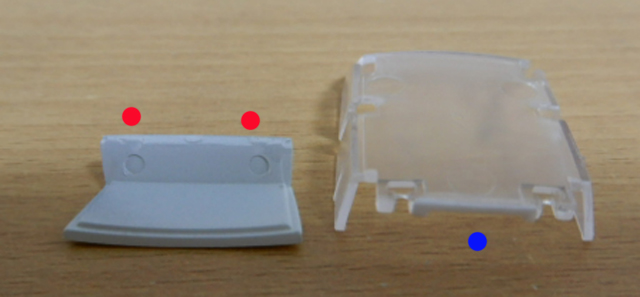 この作業で,リアゲート固定ためのとっかかりが無くなってしまったので透明部品にプラ板を貼ってのりしろ(青丸)としました。
