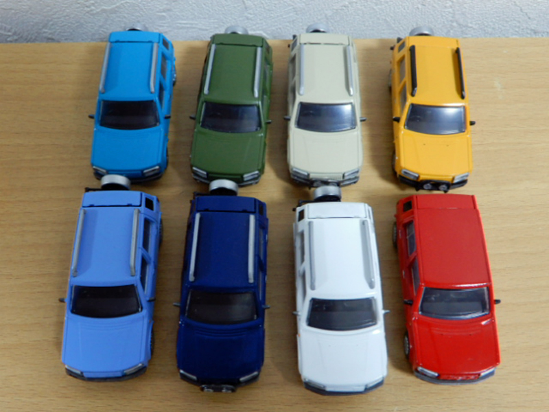 7 6台を素組した後,あまりのボディを全塗装し,2台組み上げました。1つは,ルーフキャリアとごついスペアタイヤを廃したファミリーカー仕様の前期型。1つは,黄色い車体と黒いバンパーの後期型です。