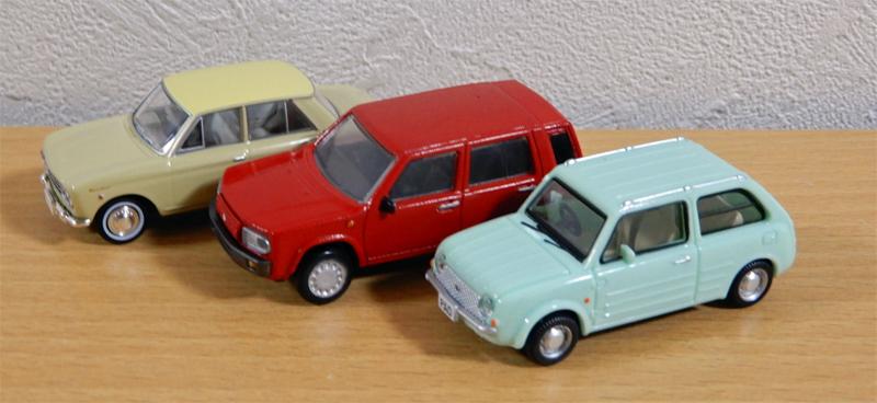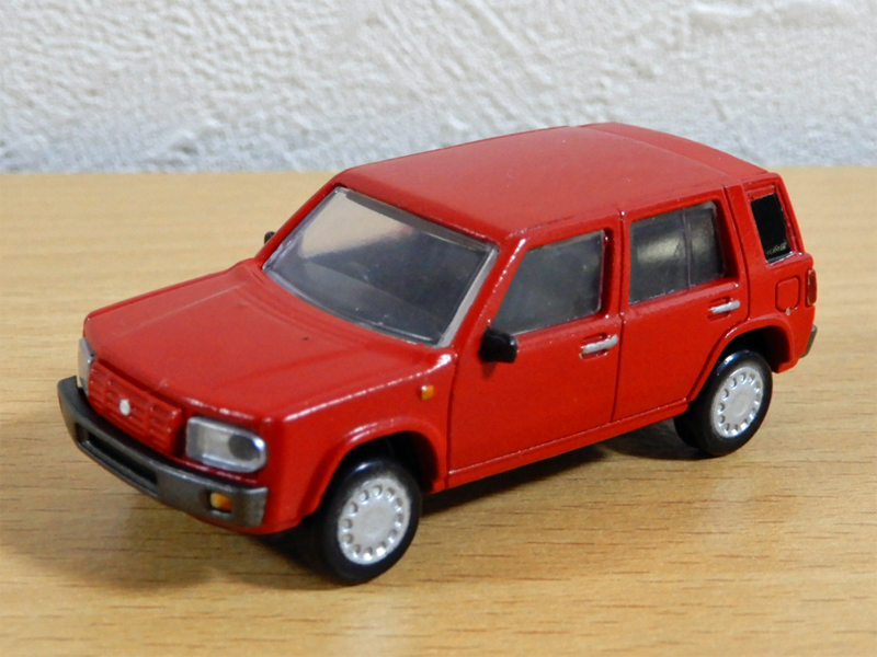 娘と某ショッピングモールのガチャガチャのお店を覗いていたら,1/64スケールのニッサン・ラシーンが¥300で出ていました。巡り合わせが良かったら,ファミリーカーとして乗ってみたかった車(当時乗っていた車がダメになる前にラシーンの生産が終わってしまいました。)です。試しにガチャッとやってみると・・・グリーンのが出てきました。全6色でなかなかよさげだけれど,組み立てキットになってるね・・・。