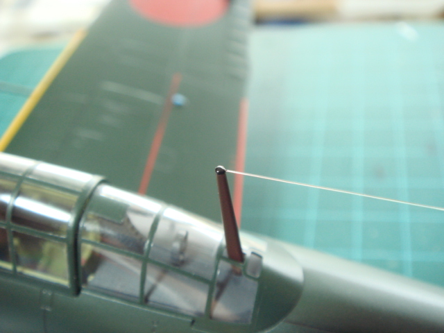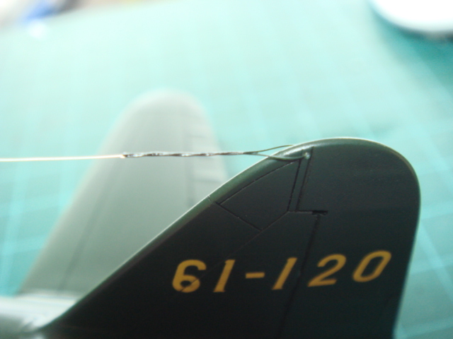 アンテナ線は垂直尾翼に0.3mmの穴を開けてよじってから取り付けます↓