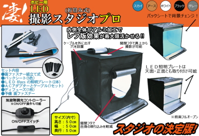 ④ご好評を頂きました凄!シリーズ撮影スタジオに特大サイズが新登場!次の撮影スタジオは内側がレフ版になっており、LEDライトの光をしっかり反射。0%-100%の明るさは無段階調光できます!マルチアングルでの撮影にも最適、お好きな角度から被写体を撮影可能。5色のバックシートで被写体の良さを最大限引出せます。