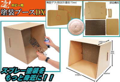 ④凄!シリーズに新しく塗装ブースDXが仲間入り!家での塗装作業も組立式の塗装ブースがあれば大丈夫。霧状の細かい塗料もブース内のハニカムフィルターでしっかりキャッチ!ブース内、つくりが広い仕様となっているため大きなパーツでも難なく塗装可能です!ご家庭でのプラモデル作成に役立つ一品となっております。