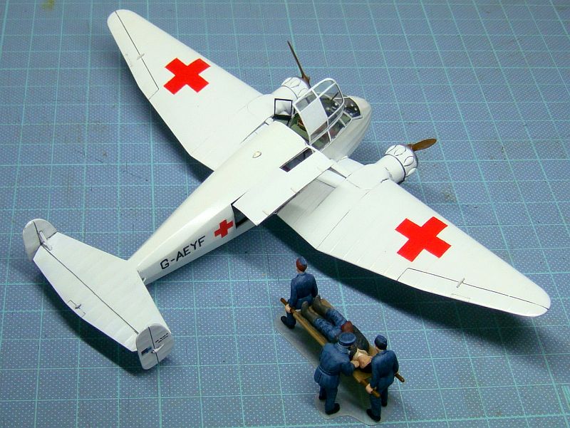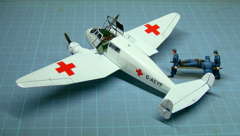 資料によると本機には医師が同乗し、機内で簡単な検査や酸素吸入、輸血等の処置も行えたということなので、単に患者輸送だけでなく現在のドクターヘリに近い運用だったようです。「G-AEYF」はイギリス赤十字で使われた後にデンマークに送られ、「OY-DAZ」のコードレターで戦後もAir Ambulanceとして活躍。退役後、現在はデンマークの博物館で復元展示されて余生を送っています。