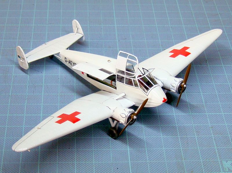 ●イギリス赤十字の「G-AEYF」機として仕上げました。塗装は全面白で各所に赤十字。後部胴体に民間機コード「G-AEYF」、方向舵に英国民間航空旗(のつもり)を描き込み。全面白塗装の機体をあまり汚したくないので、ウォッシングは最小限に止めました。