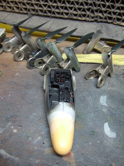 (写真5) コクピットの中を塗ってノーズコーン着けてキャノピーでの封印待ち。コクピットの塗料が完全に乾くまでの間にペラでも塗っておこうかね。