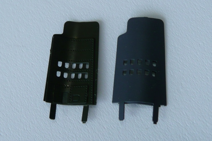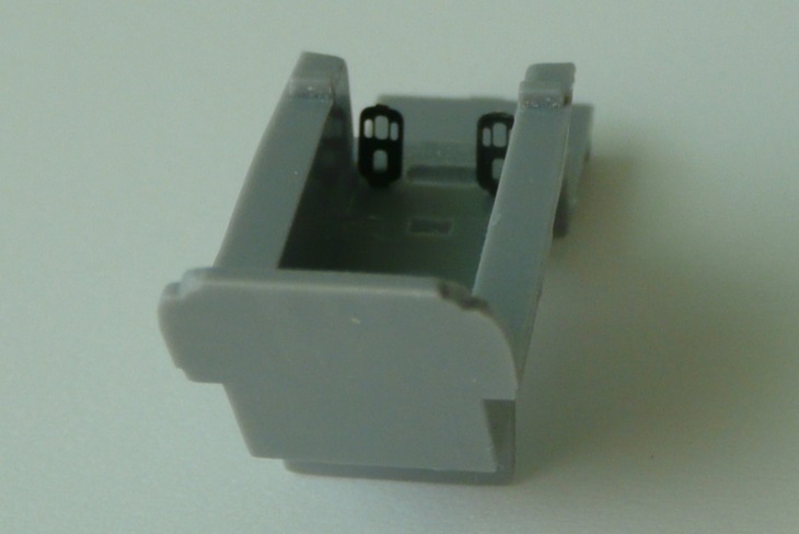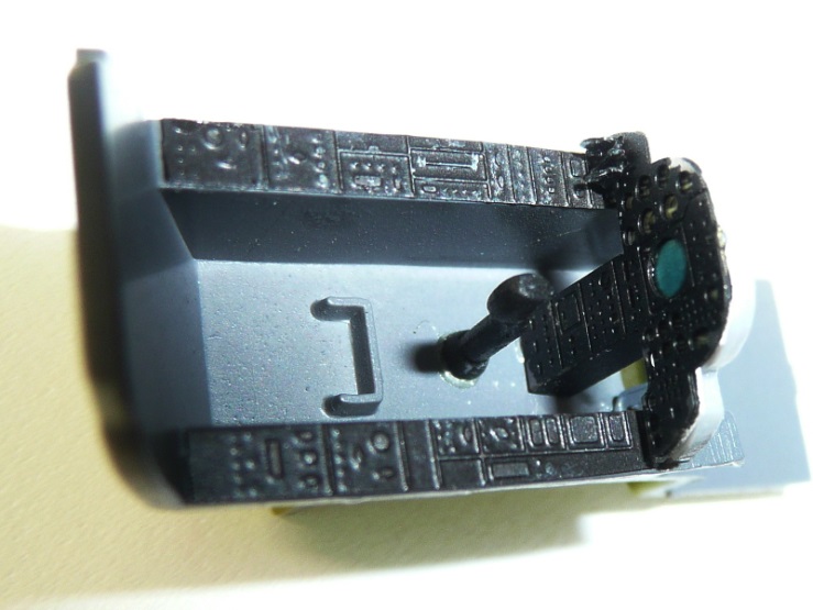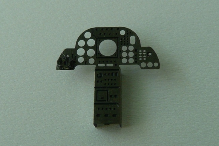 (写真2)がエッチングパーツの主計器盤で艶消しの黒を塗っています。計器の部分には裏側から印刷した計器盤を貼り付けるようになっています。サイドコンソールも艶消しの黒で塗装し、スイッチ類を白やグレーで塗分けますが1/72スケールでは目が痛くなるだけです。