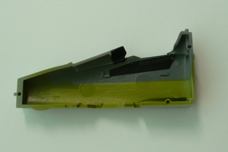 コクピットが完成したので、これを組み込む前胴部を組み立てます。まず左右の前胴部パーツの内側を塗装します。1項で書きましたように前脚収納部はインテリアグリーンですので、(写真4)のように上部をダークグレー、下部をインテリアグリーンで塗分けます。