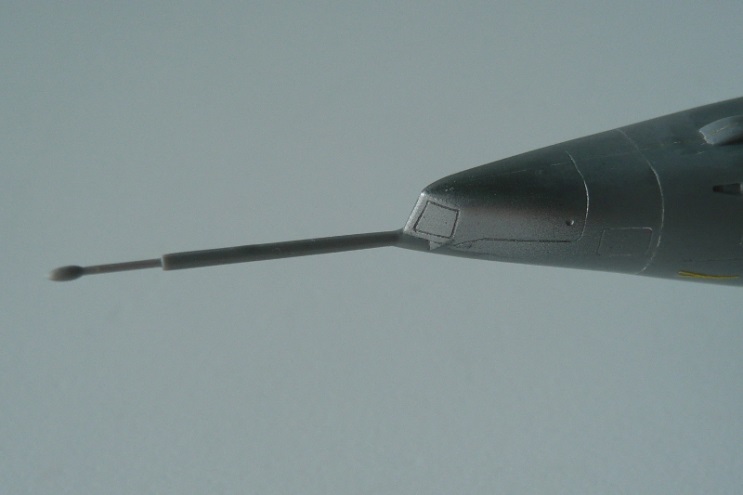 ここでピトー管部をこの段階で取り付けるかどうか迷ったのですが、機首先端のウィンドウの塗装との関係でこの段階で接着することにしました。接着して整形後LRMTSのウィンドウの塗装を行いました。(写真6)