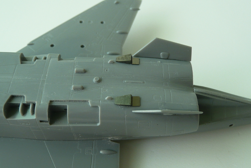 そして左右のベントラルフィンの内側にエッチングパーツで組み立てたフレアディスペンサーを2個取り付けました。(写真8)