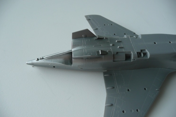 まず前胴部と中後胴部を結合します。若干のすり合わせは必要ですが、精度よくフィットしました。インテイクを取り付ける前に側胴部に位置するインテイク部の取り付け面をツヤ消しの黒に塗っておきます。(写真9)