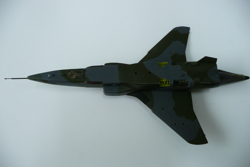 そしてダークグリーンを吹き付けてオーバーオール迷彩は出来上がりですが、まだ細部の塗装が残っています。機体背部のブレードアンテナをクリームイエロー(前縁が黒)に、右翼付け根をツヤ消しの黒、アデン砲の砲口周りをココアブラウン、エアーブレーキ収納部をダークグリーン、主脚収納部をインテリアグリーン、尾端を黒に等々、兎に角塗分けが大変でした。出来上がった機体上面と下面の塗装が(写真18)と(写真19)です。