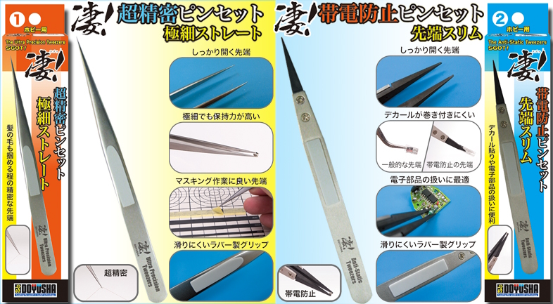 ④「凄!工具シリーズ」に新しくピンセットが登場!今回は「超精密ピンセット 極細ストレート」と「帯電防止ピン セット 先端スリム」の2種類をご用意。超精密ピンセットは極細でも保持力が高く、細かい作業に打ってつけ!帯電防止ピンセットは電子部品の扱いや、デカールの貼り付け時に便利な逸品となっております。ボディには滑りにくいラバー製グリップが付いており、長時間の作業にも大活躍すること間違いなし!
