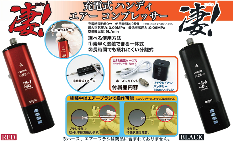 バッテリーで、場所を選ばずに塗装をサポート。付属のジョイントやホース、エアーブラシを組合わせれば、コンプレッサーを置いたまま作業が可能。カラーはレッドとブラックの2色をご用意!バッテリーの残量も見えて便利な仕様です。■本体電池:750mAh 5V2A(充電式) ■充電時間:約50分 ■使用時間:約25分