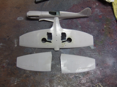 (写真2) 魅惑の無武装バージョンの翼、Dウィング。パネルラインが全然違うのであちこちスジ彫り埋めたり彫ったりしろ、などと取説に書いてある。フジミの得意技でありますなぁ。基本このキットMkⅩⅣだし結構メンドイ。純粋なDウィングのキットが欲しくなるよね。