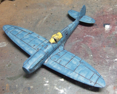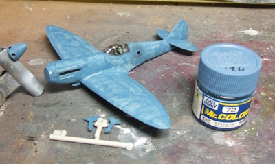 (写真5)最大のお楽しみ、機体塗装に突入であります。先ずはミディアムブルーでざっと筆塗り。