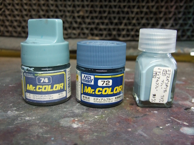(写真6) 上塗りはエアスペリオリティブルー(長い)とミディアムブルーを混ぜた色で。上塗りする前に筆塗りで下地が透けている部分をエアスペリオリティブルー単色でフォローしておくのがミソ。