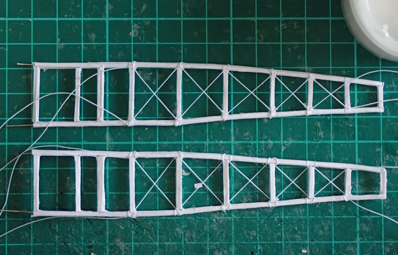 胴体左右のフレームをステンレス針金を芯にした厚手のコピー用紙で組みました。補強用の張線をこの段階で施しておきます。張線はボンドで固めた木綿糸を使っています。