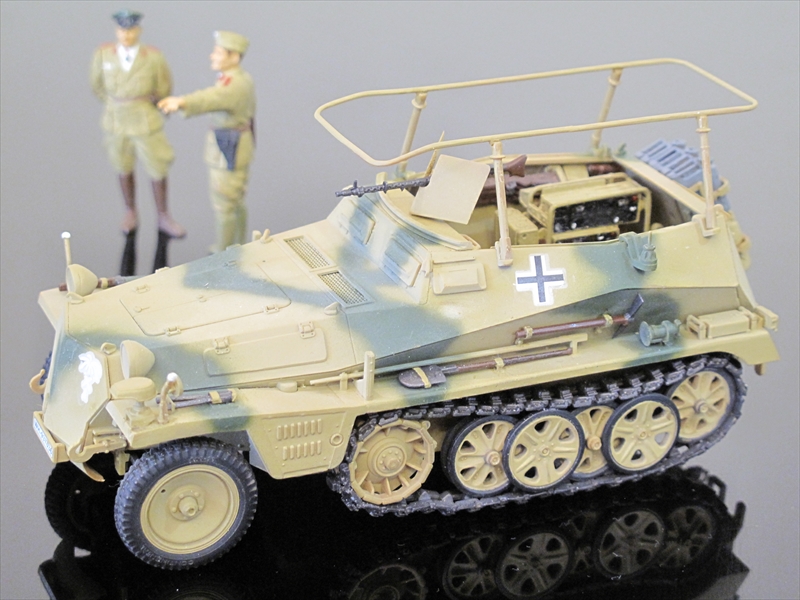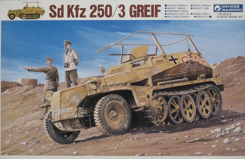 Sdkfz.250はWWII初期に開発された乗員2名・兵員4名、5.5tonで100馬力のエンジンをもつドイツの偵察用半軌装甲車です。その車体の派生車種で大型アンテナと無線送受信機を搭載して指揮装甲車としたのがSdkfz.250_3です。キットの箱絵はGreifと書かれた車体なのでロンメル将軍のアフリカ軍団の様子を表しているのでしょう。