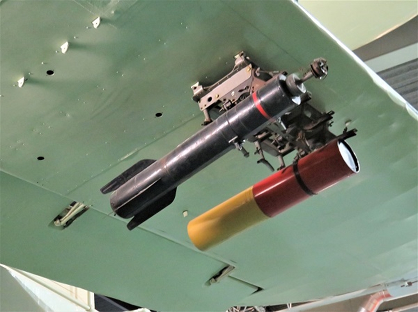 ソードフィッシュⅡは下翼を金属製に強化し、ロケット弾8発の搭載を可能にして、1943年から導入されました。展示のHS618はブラックバーン社で生産され、1943年から護衛空母ハンターに搭載されて、北大西洋の哨戒に従事しています。