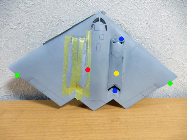 これでも外翼と本体のつなぎ目が微妙にひずんでいます。でも,B-2に一生を捧げるわけにはいかないので妥協、妥協。