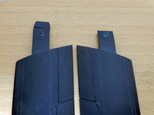 ⑥ 本体と外翼は,接着せずとも,押し込むと外れなくなる設計になっています。仮組みしてみると継ぎ目が大きく開くことが分かったのでストッパーになっているところを切り離して普通に接着しました。