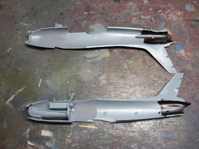 (写真4) オモリ入れてノズルも付けたら胴体貼り合せて一気にヒコーキの形に。