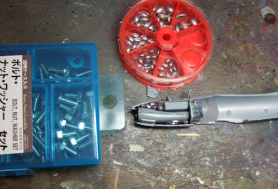 (写真3) 極端なテールヘビーじゃないけれど、念のため過剰な位にオモリを詰め込んでおく。転ばぬ先の杖ですな。こういうとき百均のお店はありがたいのう。