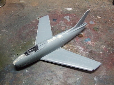 (写真2) 取敢えず機体内部色を塗ってコクピットをぺたっと貼ってゆく。スウォードのプラは柔らかいので削りすぎ注意です。加工し易いのはいいんだけれどもね~