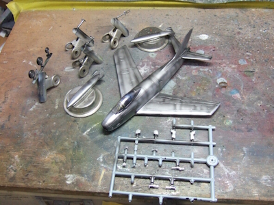 (写真8) ギンギラに過ぎるとちょびっとアレなので、セミグロスクリアーで落ち着かせることにします。スミ入れの為の下処理もかねて、って事で。ナマ吹きのシルバーの上に直接スミ入れすると、銀の粒子の隙間にまでスミが入っていって全面に拡がっちゃうのよ。スミ入れしないって決めてるのなら、銀ナマのまま完成決め込んでも良いのですけれどもね。