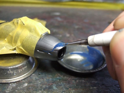 (写真9) トップコート吹いた後はマーキングカラーを塗っていきます。ノーズ周りはマスキングが面倒くさいので筆塗りでペタペタ。